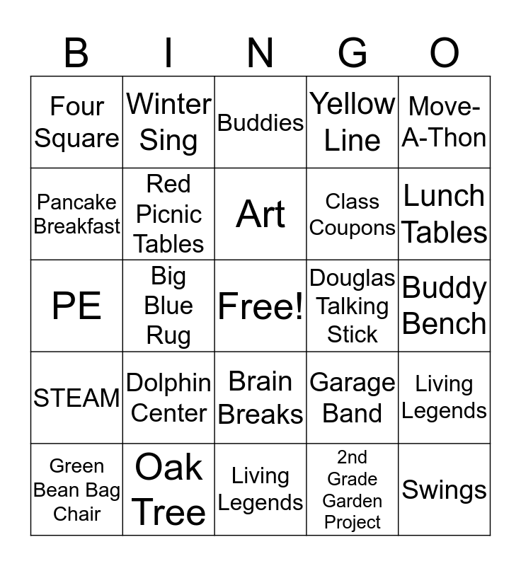 This bingo card has a free space and 24 words: Dolphin Center, Oak Tree, Art, Green Bean Bag Chair, Move-A-Thon, Four Square, Pancake Breakfast, Winter Sing, Douglas Talking Stick, Brain Breaks, Class Coupons, PE, Garage Band, Living Legends, Red Picnic Tables, 2nd Grade Garden Project, Buddy Bench, Buddies, Lunch Tables, Big Blue Rug, Swings, STEAM, Yellow Line and Living Legends.