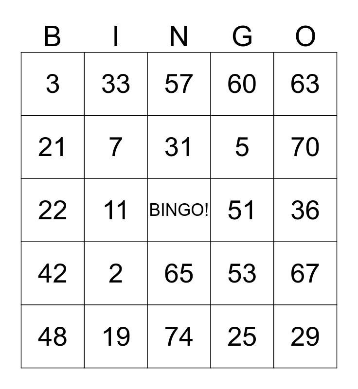 This bingo card has a free space and 24 words: 2, 19, 31, 48, 63, 3, 21, 33, 51, 65, 5, 22, 53, 67, 7, 25, 36, 57, 70, 11, 29, 42, 60 and 74.