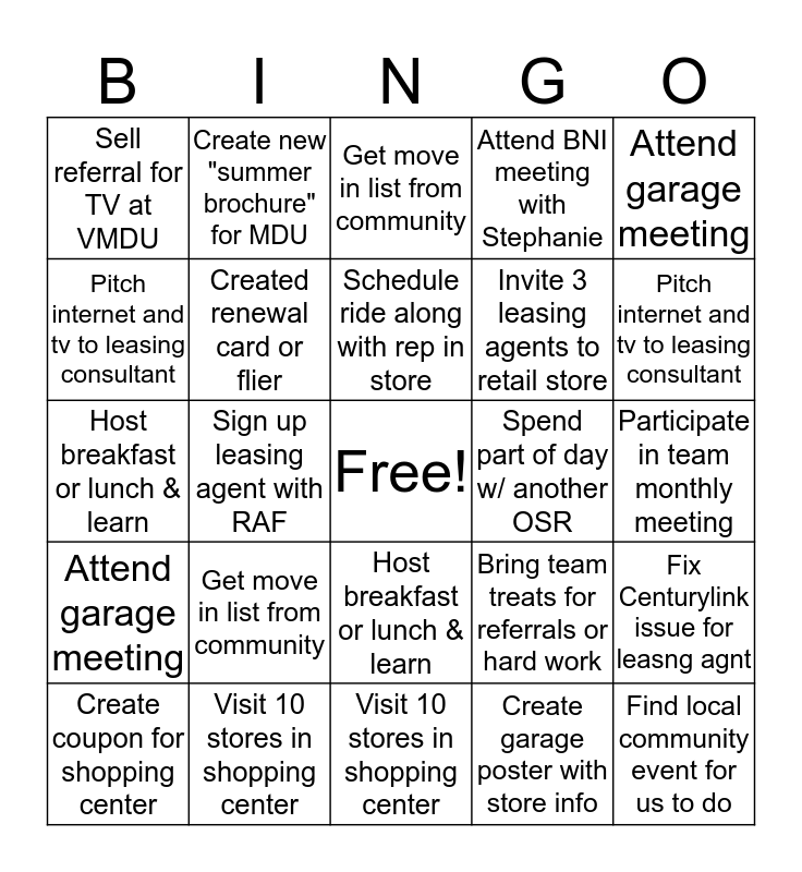 This bingo card has a free space and 24 words: Get move in list from community, Visit 10 stores in shopping center, Schedule ride along with rep in store, Create coupon for shopping center, Attend garage meeting, Sell referral for TV at VMDU, Pitch internet and tv to leasing consultant, Create new "summer brochure" for MDU, Spend part of day w/ another OSR, Host breakfast or lunch & learn, Invite 3 leasing agents to retail store, Host breakfast or lunch & learn, Bring team treats for referrals or hard work, Fix Centurylink issue for leasng agnt, Created renewal card or flier, Create garage poster with store info, Participate in team monthly meeting, Get move in list from community, Pitch internet and tv to leasing consultant, Sign up leasing agent with RAF, Find local community event for us to do, Attend garage meeting, Attend BNI meeting with Stephanie and Visit 10 stores in shopping center.