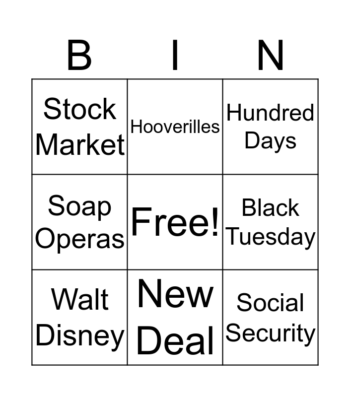This bingo card has a free space and 8 words: Black Tuesday, Hundred Days, Hooverilles, Walt Disney, Stock Market, Social Security, Soap Operas and New Deal.