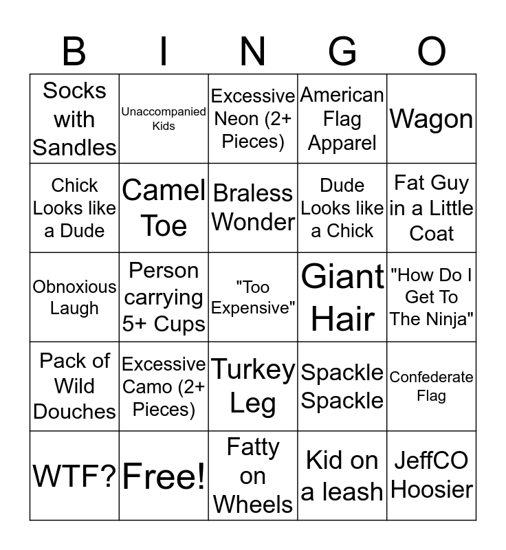 This bingo card has 30 words: Free!, Mom with too many kids, Person carrying 5+ Cups, Retail Steve, Socks with Sandles, Excessive Neon (2+ Pieces), Camel Toe, Turkey Leg, Giant Hair, Fatty on Wheels, "How Do I Get To The Ninja", "Too Expensive", Kid on a leash, JeffCO Hoosier, Fat Guy in a Little Coat, Meth Mouth, Spackle Spackle, Pack of Wild Douches, Excessive Camo (2+ Pieces), Wagon, Obnoxious Laugh, Mullet, Unaccompanied Kids, Dude Looks like a Chick, Chick Looks like a Dude, American Flag Apparel, Confederate Flag, WTF?, Braless Wonder and Man Bun.