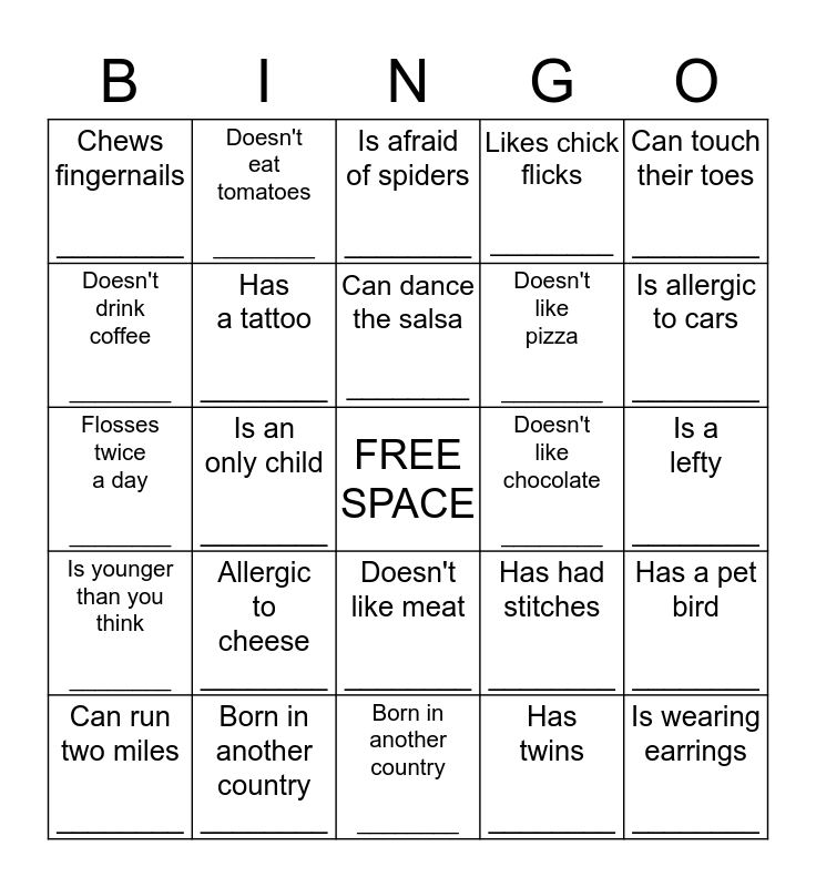 This bingo card has a free space and 24 words: Allergic to cheese ________, Born in another country ________, Can dance the salsa ________, Can run two miles ________, Can touch their toes ________, Chews fingernails ________, Doesn't drink coffee ________, Doesn't eat tomatoes ________, Doesn't like chocolate ________, Doesn't like meat ________, Doesn't like pizza ________, Flosses twice a day ________, Has had stitches ________, Has a pet bird ________, Has a tattoo ________, Has twins ________, Is a lefty ________, Is afraid of spiders ________, Is allergic to cars ________, Is an only child ________, Is wearing earrings ________, Is younger than you think ________, Likes chick flicks ________ and Born in another country ________.
