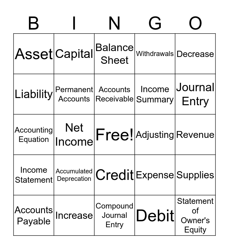 This bingo card has a free space and 26 words: Credit, Debit, Accounts Receivable, Increase, Decrease, Asset, Liability, Capital, Revenue, Expense, Income Summary, Accounting Equation, Supplies, Accounts Payable, Net Income, Net Loss, Withdrawals, Income Statement, Balance Sheet, Statement of Owner's Equity, Journal Entry, Compound Journal Entry, Adjusting, Accumulated Deprecation, Permanent Accounts and Temporary Accounts.