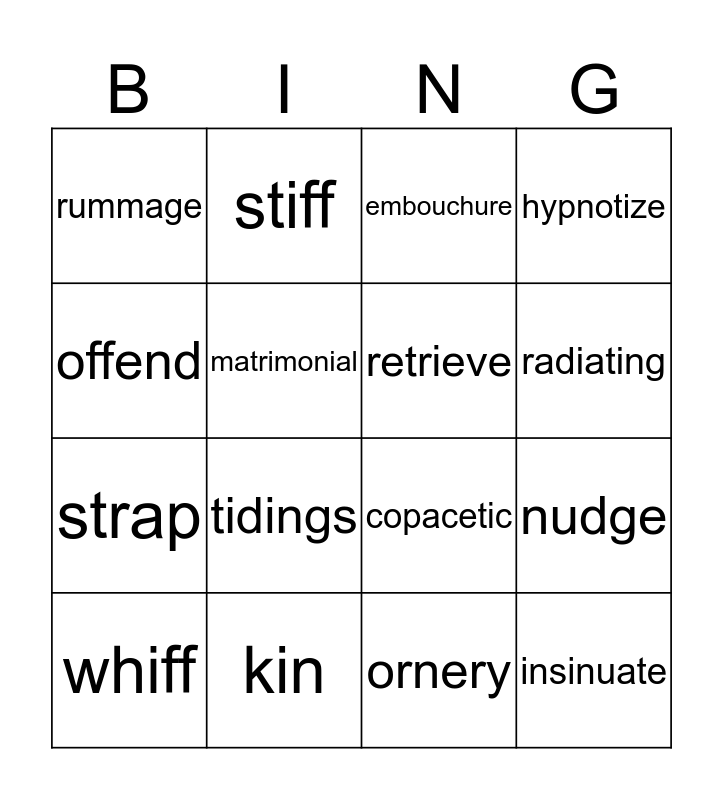 This bingo card has 19 words: copacetic, crow, embouchure, insinuate, nudge, offend, ornery, rummage, stiff, strap, tidings, matrimonial, retrieve, kin, whiff, gait, hypnotize, radiating and acquaintances.