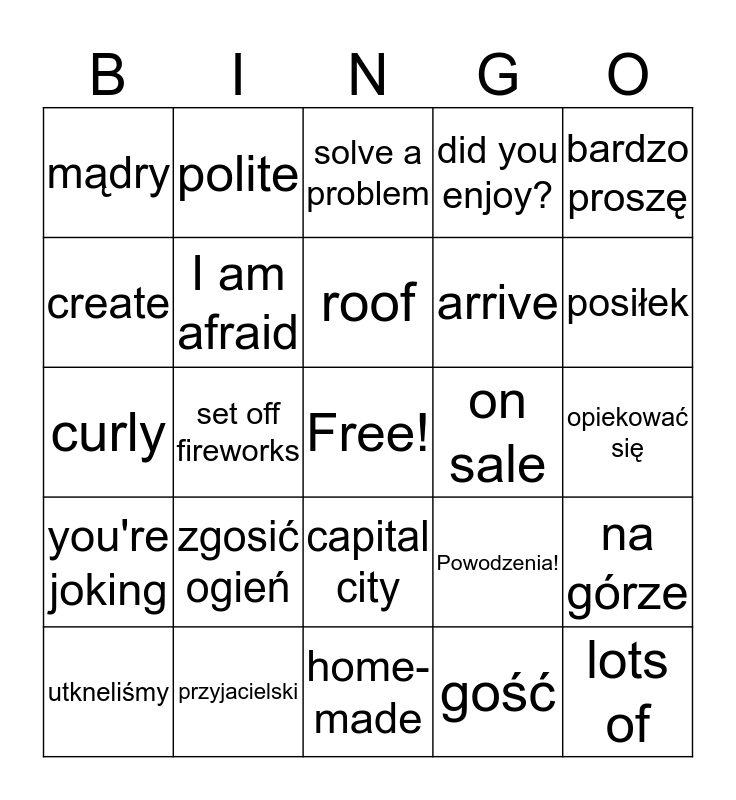 This bingo card has a free space and 24 words: zgosić ogień, przyjacielski, roof, utkneliśmy, bardzo proszę, mądry, create, polite, on sale, capital city, arrive, curly, Powodzenia!, na górze, I am afraid, gość, opiekować się, solve a problem, posiłek, set off fireworks, lots of, you're joking, did you enjoy? and home-made.
