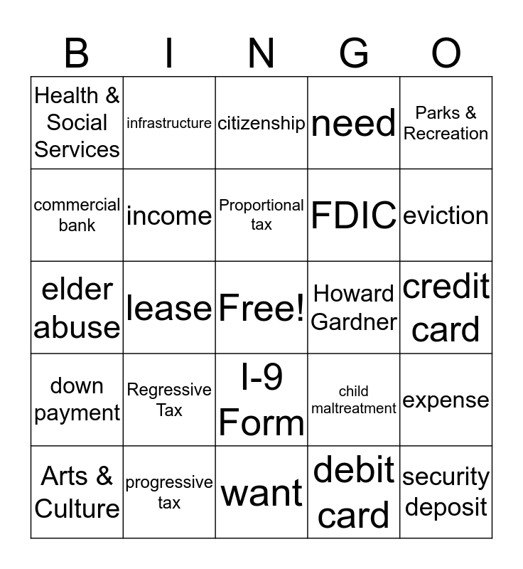This bingo card has a free space and 24 words: Regressive Tax, progressive tax, Proportional tax, Arts & Culture, Parks & Recreation, Health & Social Services, commercial bank, infrastructure, Howard Gardner, I-9 Form, FDIC, elder abuse, child maltreatment, expense, income, debit card, credit card, citizenship, eviction, lease, security deposit, down payment, need and want.
