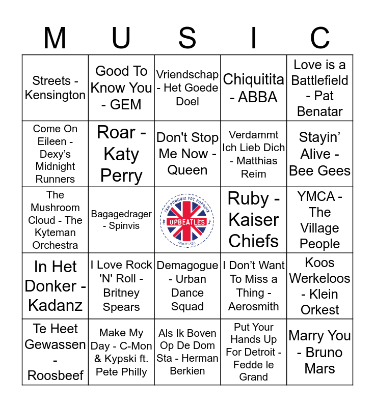 This bingo card has a free space and 24 words: I Love Rock 'N' Roll - Britney Spears, Make My Day - C-Mon & Kypski ft. Pete Philly, Don't Stop Me Now - Queen, Te Heet Gewassen - Roosbeef, Love is a Battlefield - Pat Benatar, Streets - Kensington, Come On Eileen - Dexy’s Midnight Runners, Good To Know You - GEM, Ruby - Kaiser Chiefs, Demagogue - Urban Dance Squad, Verdammt Ich Lieb Dich - Matthias Reim, The Mushroom Cloud - The Kyteman Orchestra, I Don’t Want To Miss a Thing - Aerosmith, Koos Werkeloos - Klein Orkest, Roar - Katy Perry, Put Your Hands Up For Detroit - Fedde le Grand, YMCA - The Village People, Vriendschap - Het Goede Doel, Stayin’ Alive - Bee Gees, Bagagedrager - Spinvis, Marry You - Bruno Mars, In Het Donker - Kadanz, Chiquitita - ABBA and Als Ik Boven Op De Dom Sta - Herman Berkien.