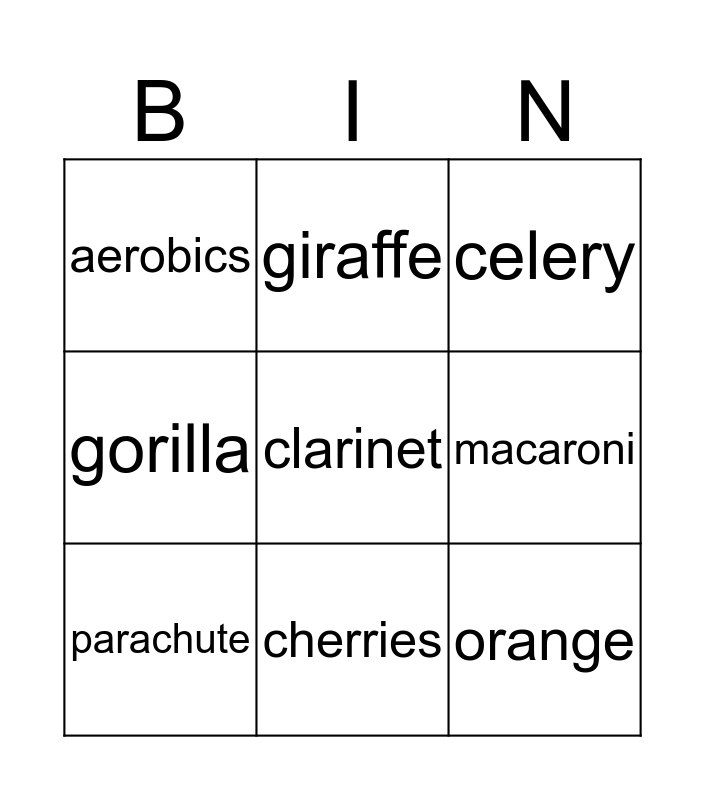 This bingo card has a free space and 8 words: macaroni, celery, giraffe, parachute, aerobics, orange, gorilla and cherries.