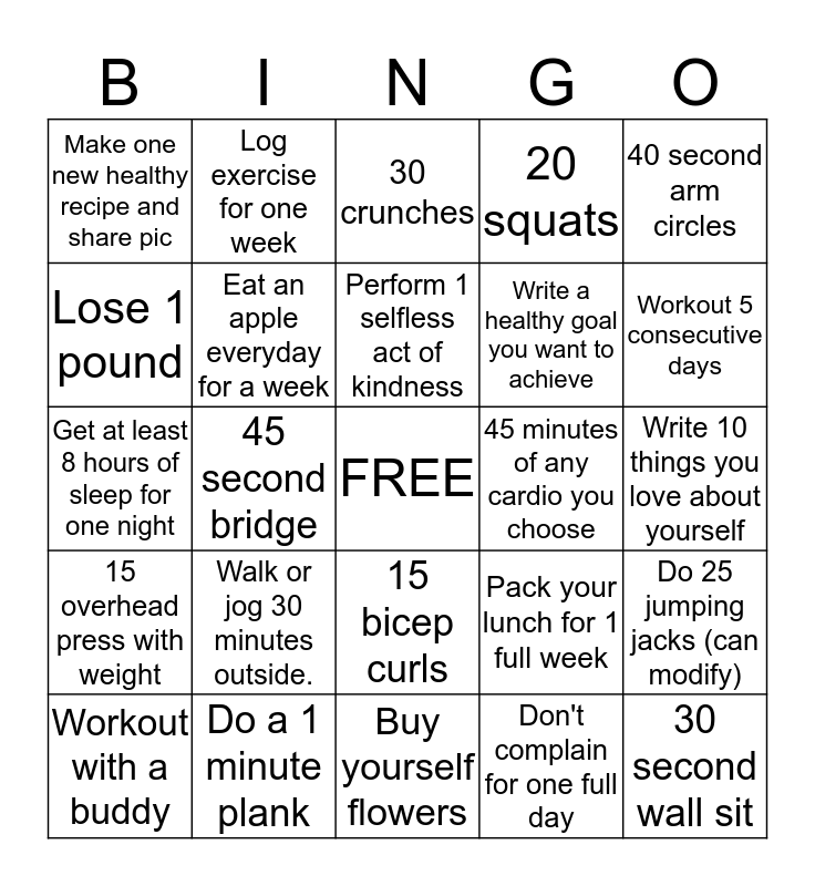 This bingo card has a free space and 24 words: Walk or jog 30 minutes outside., Do a 1 minute plank, Perform 1 selfless act of kindness, Workout with a buddy, 40 second arm circles, Make one new healthy recipe and share pic, Lose 1 pound, Log exercise for one week, 45 minutes of any cardio you choose, 15 bicep curls, Write a healthy goal you want to achieve, Get at least 8 hours of sleep for one night, Pack your lunch for 1 full week, Do 25 jumping jacks (can modify), Eat an apple everyday for a week, Don't complain for one full day, Write 10 things you love about yourself, 30 crunches, Workout 5 consecutive days, 45 second bridge, 30 second wall sit, 15 overhead press with weight, 20 squats and Buy yourself flowers.