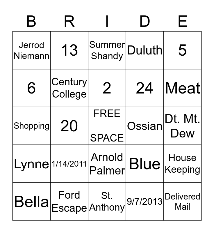 This bingo card has a free space and 42 words: Chevy Malibu, 2, 30, 1/14/2011, 9/7/2013, House Keeping, Delivered Mail, Blue Moon, Summer Shandy, Arnold Palmer, Dt. Mt. Dew, Meat, 20, 5, St. Lucia, Blue, Pink, Shopping, Wood Working, 13, 6, Duck Dynasty, MN State Fair, Jerrod Niemann, Duck Dynasty, 27, 24, Kevin & Leslie's Couch, 3, T-Bock's, Benjamin, Lynne, Century College, St. Anthony, ISU, Bella, Ford Escape, Ossian, Decorah, Subway, Duluth and Pepperoni & Green Peppers.