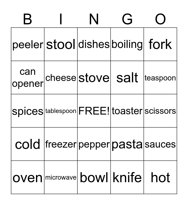 This bingo card has a free space and 24 words: freezer, microwave, stove, oven, fork, peeler, can opener, stool, toaster, pepper, salt, spices, pasta, sauces, cheese, knife, scissors, dishes, teaspoon, tablespoon, hot, cold, boiling and bowl.