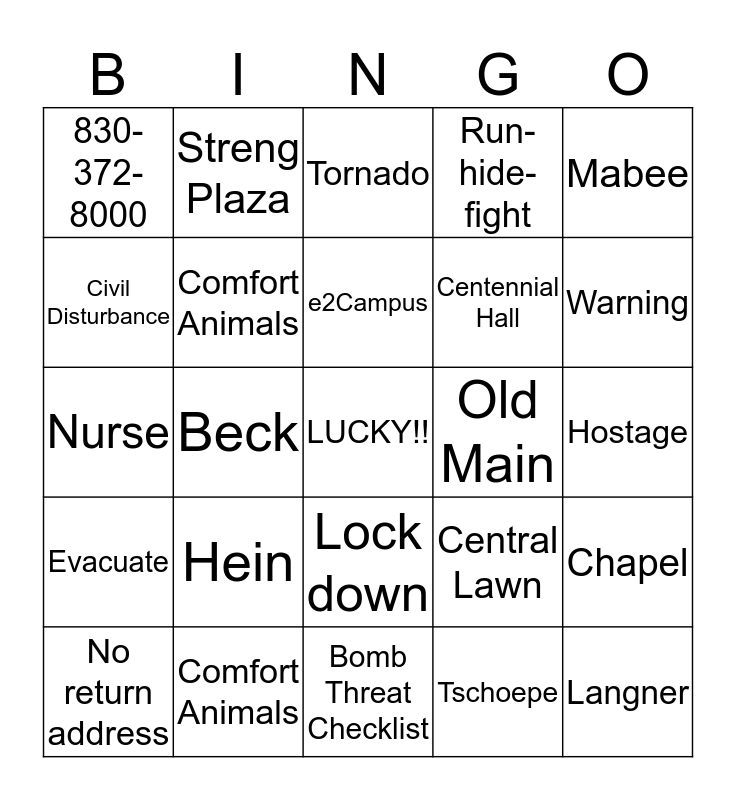 This bingo card has a free space and 37 words: Yearbook meeting, POM, Lucky, Comfort Animals, Chapel, Hein, e2Campus, Fire, Mabee, Smoke, Beck, Run-hide-fight, Langner, Hostage, Civil Disturbance, Evacuate, Library basement, Tornado, Lock down, Old Main, 830-372-8000, Warning, No return address, Bomb Threat Checklist, Watch, Tschoepe, Streng Plaza, 1109 University St, PASS, Emergency Preparedness Manual, Service Animal, Comfort Animals, Nurse, Dr. Dorsey, Central Lawn, Centennial Hall and Weston Center.