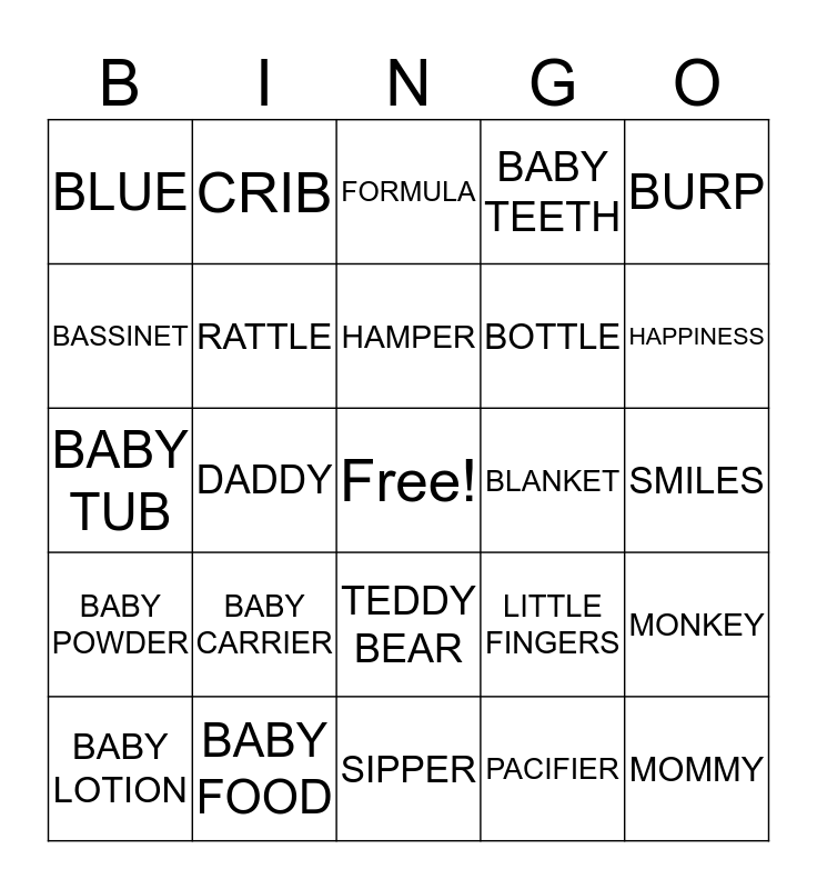 This bingo card has a free space and 24 words: BABY CARRIER, BABY FOOD, HAMPER, BABY LOTION, BURP, BLUE, BASSINET, CRIB, BLANKET, TEDDY BEAR, BOTTLE, BABY TUB, LITTLE FINGERS, MONKEY, RATTLE, PACIFIER, SMILES, FORMULA, HAPPINESS, DADDY, MOMMY, BABY POWDER, BABY TEETH and SIPPER.