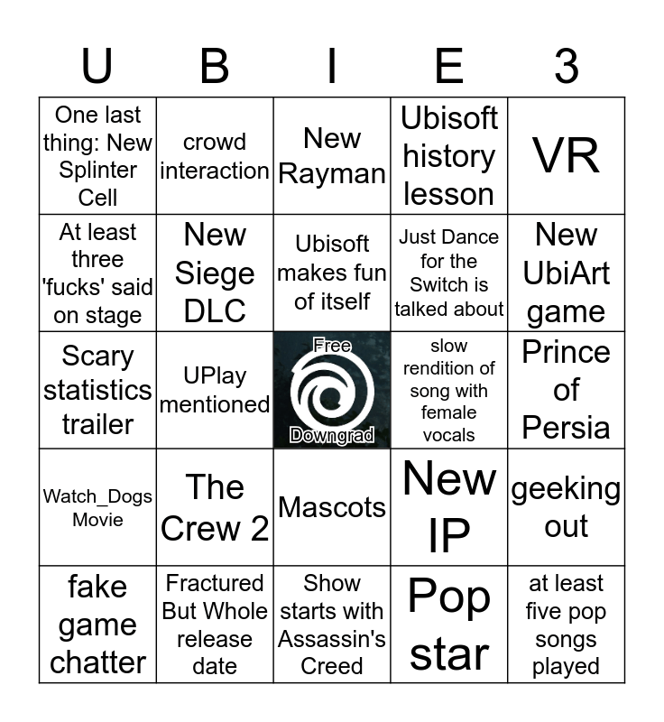 This bingo card has a free space and 24 words: The Crew 2, Fractured But Whole release date, Ubisoft makes fun of itself, fake game chatter, VR, One last thing: New Splinter Cell, At least three 'fucks' said on stage, crowd interaction, slow rendition of song with female vocals, Mascots, Just Dance for the Switch is talked about, Scary statistics trailer, New IP, geeking out, New Siege DLC, Pop star, Prince of Persia, New Rayman, New UbiArt game, UPlay mentioned, at least five pop songs played, Watch_Dogs Movie, Ubisoft history lesson and Show starts with Assassin's Creed.