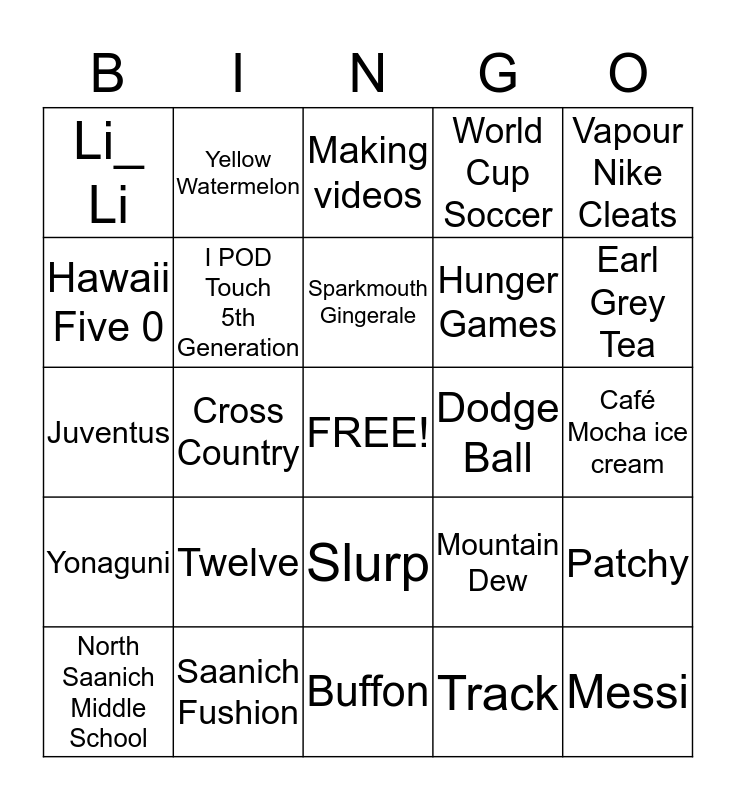 This bingo card has a free space and 24 words: Twelve, Saanich Fushion, Sparkmouth Gingerale, North Saanich Middle School, Vapour Nike Cleats, Li_ Li, Hawaii Five 0, Yellow Watermelon, Dodge Ball, Slurp, Hunger Games, Juventus, Mountain Dew, Patchy, I POD Touch 5th Generation, Track, Café Mocha ice cream, Making videos, Earl Grey Tea, Cross Country, Messi, Yonaguni, World Cup Soccer and Buffon.