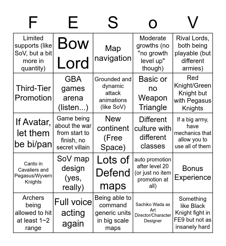 This bingo card has a free space and 24 words: SoV map design (yes, really), Full voice acting again, Grounded and dynamic attack animations (like SoV), Archers being allowed to hit at least 1~2 range, Rival Lords, both being playable (but different armies), Limited supports (like SoV, but a bit more in quantity), Third-Tier Promotion, Bow Lord, Different culture with different classes, Lots of Defend maps, Basic or no Weapon Triangle, If Avatar, let them be bi/pan, auto promotion after level 20 (or just no item promotion at all), Bonus Experience, GBA games arena (listen...), Sachiko Wada as Art Director/Character Designer, If a big army, have mechanics that allow you to use all of them, Map navigation, Red Knight/Green Knight but with Pegasus Knights, Game being about the war from start to finish, no secret villain, Something like Black Knight fight in FE9 but not as insanely hard, Canto in Cavaliers and Pegasus/Wyvern Knights, Moderate growths (no "no growth level up" though) and Being able to command generic units in big scale maps.