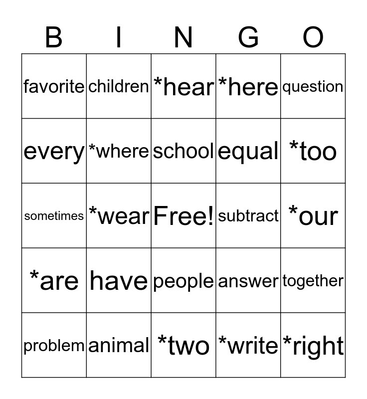 This bingo card has a free space and 24 words: have, animal, school, problem, question, favorite, every, children, subtract, people, equal, sometimes, answer, together, *where, *write, *our, *hear, *too, *wear, *right, *are, *here and *two.