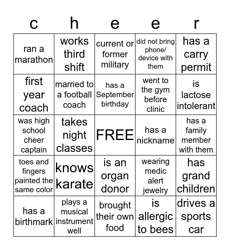 This bingo card has a free space and 24 words: knows karate, plays a musical instrument well, has a September birthday, has a birthmark, has a carry permit, ran a marathon, first year coach, works third shift, has a nickname, is an organ donor, went to the gym before clinic, was high school cheer captain, wearing medic alert jewelry, has grand children, married to a football coach, is allergic to bees, has a family member with them, current or former military, is lactose intolerant, takes night classes, drives a sports car, toes and fingers painted the same color, did not bring phone/ device with them and brought their own food.