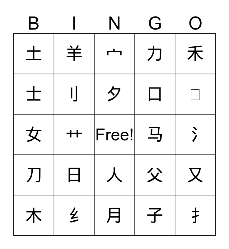 This bingo card has a free space and 25 words: 日, 月, 夕, 木, 禾, 土, 士, 羊, 马, 人, 口, 女, 父, 又, 刂, 巾, 氵, 宀, ⺮, 艹, 扌, 纟, 刀, 力 and 子.