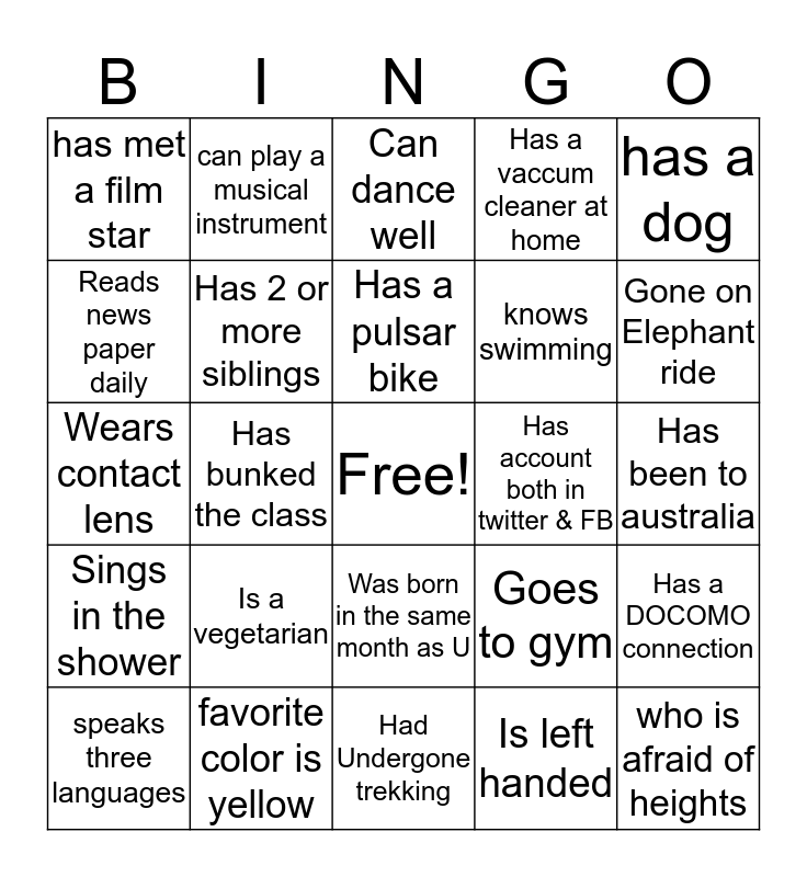 This bingo card has a free space and 24 words: Is a vegetarian, favorite color is yellow, Has a pulsar bike, speaks three languages, has a dog, has met a film star, Reads news paper daily, can play a musical instrument, Has account both in twitter & FB, Was born in the same month as U, knows swimming, Wears contact lens, Goes to gym, Has a DOCOMO connection, Has 2 or more siblings, Is left handed, Has been to australia, Can dance well, Gone on Elephant ride, Has bunked the class, who is afraid of heights, Sings in the shower, Has a vaccum cleaner at home and Had Undergone trekking.