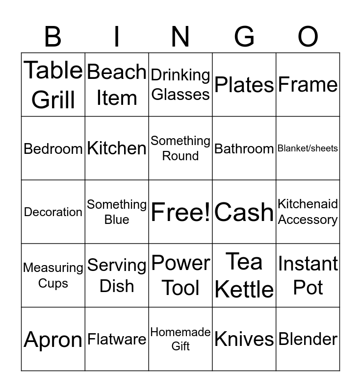 This bingo card has a free space and 44 words: Pots/Pans, Blender, Gift Card, Apron, Cutting Board, Knives, Drinking Glasses, Wine, Frame, Flatware, Plates, Cash, Power Tool, Serving Dish, Candles, Homemade Gift, Monogram, Decoration, Bakeware, Blanket/sheets, Beach Item, Tupperware, Waffle Maker, Table Grill, Outdoor Item, Kitchenaid Accessory, Crock Pot, Ice Bucket, Tea Kettle, Measuring Cups, Luggage, Instant Pot, Camping Gear, Something Soft, Something Blue, Something Metal, Cast Iron, Something Fuzzy, Something Round, Bedroom, Bathroom, Living Room, Kitchen and Dining Room.