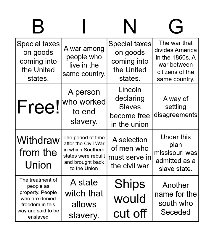 This bingo card has 16 words: A state witch that allows slavery., Under this plan missisouri was admitted as a slave state., Special taxes on goods coming into the United states., Special taxes on goods coming into the United states., Withdraw from the Union, A war among people who live in the same country., A selection of men who must serve in the civil war, Ships would cut off, Free!, A person who worked to end slavery., The treatment of people as property. People who are denied freedom in this way are said to be enslaved, The war that divides America in the 1860s. A war between citizens of the same country., The period of time after the Civil War in which Southern states were rebuilt and brought back to the Union, A way of settling disagreements, Lincoln declaring Slaves become free in the union and Another name for the south who Seceded.