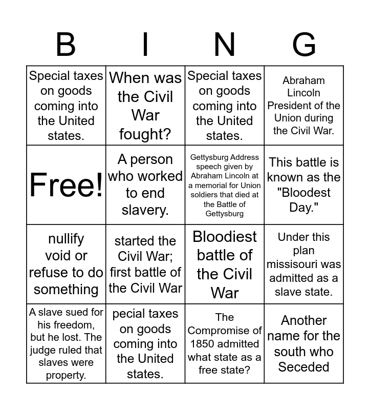 This bingo card has 16 words: pecial taxes on goods coming into the United states., Under this plan missisouri was admitted as a slave state., Special taxes on goods coming into the United states., Special taxes on goods coming into the United states., nullify void or refuse to do something, When was the Civil War fought?, Bloodiest battle of the Civil War, The Compromise of 1850 admitted what state as a free state?, Free!, A person who worked to end slavery., A slave sued for his freedom, but he lost. The judge ruled that slaves were property., Abraham Lincoln President of the Union during the Civil War., started the Civil War; first battle of the Civil War, This battle is known as the "Bloodest Day.", Gettysburg Address speech given by Abraham Lincoln at a memorial for Union soldiers that died at the Battle of Gettysburg and Another name for the south who Seceded.