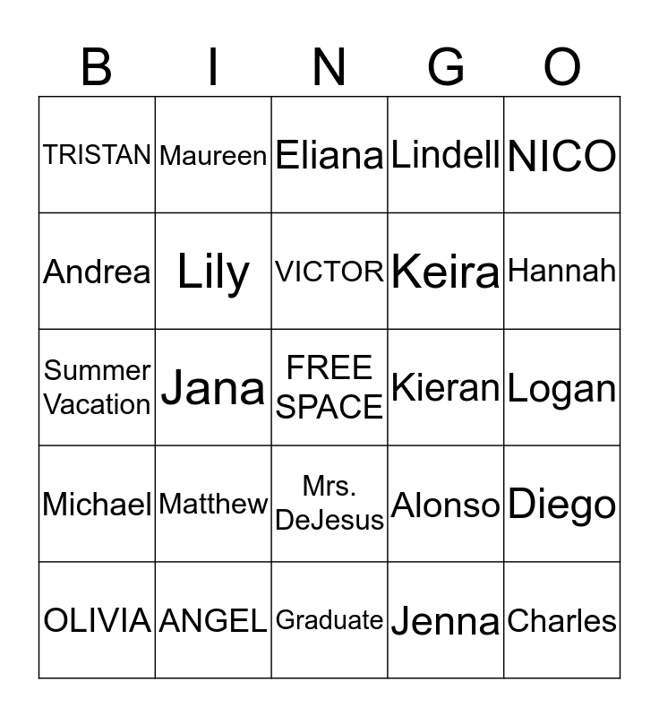 This bingo card has a free space and 24 words: Matthew, ANGEL, VICTOR, OLIVIA, NICO, TRISTAN, Andrea, Maureen, Kieran, Mrs. DeJesus, Keira, Summer Vacation, Alonso, Diego, Lily, Jenna, Logan, Eliana, Hannah, Jana, Charles, Michael, Lindell and Graduate.