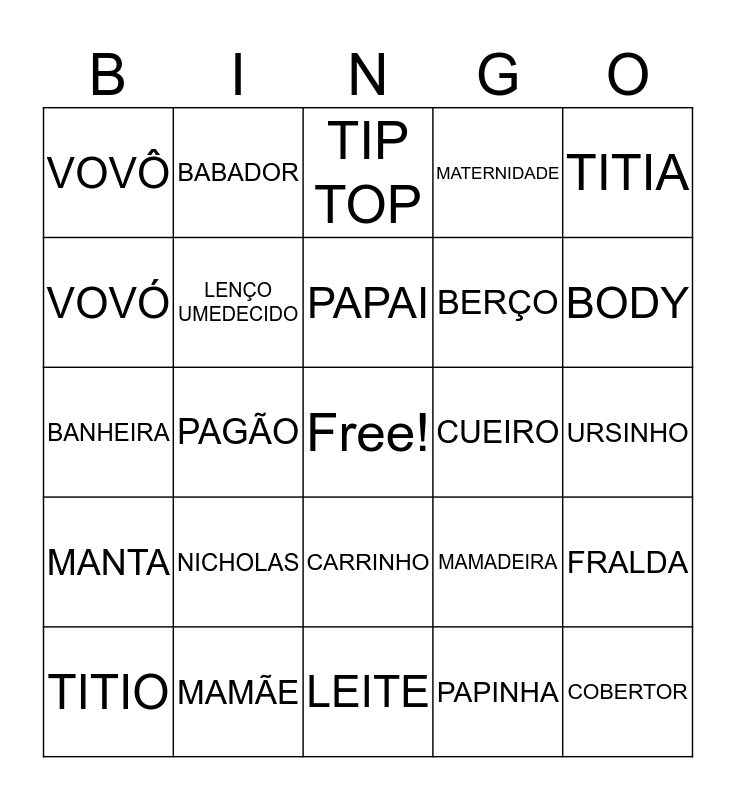 This bingo card has a free space and 24 words: NICHOLAS, MAMÃE, PAPAI, TITIO, TITIA, VOVÔ, VOVÓ, BABADOR, CUEIRO, CARRINHO, BERÇO, BANHEIRA, MAMADEIRA, FRALDA, LENÇO UMEDECIDO, PAPINHA, URSINHO, TIP TOP, BODY, PAGÃO, COBERTOR, MANTA, MATERNIDADE and LEITE.