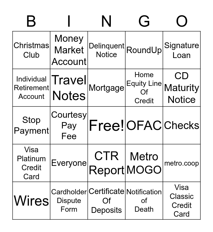 This bingo card has a free space and 24 words: Everyone, Cardholder Dispute Form, Mortgage, Wires, Signature Loan, Christmas Club, Individual Retirement Account, Money Market Account, OFAC, CTR Report, Home Equity Line Of Credit, Stop Payment, Metro MOGO, metro.coop, Travel Notes, Notification of Death, Checks, Delinquent Notice, CD Maturity Notice, Courtesy Pay Fee, Visa Classic Credit Card, Visa Platinum Credit Card, RoundUp and Certificate Of Deposits.