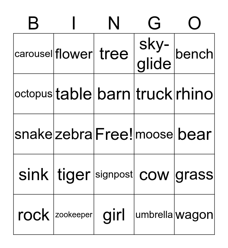 This bingo card has a free space and 24 words: tiger, zookeeper, barn, rock, bench, carousel, octopus, flower, moose, signpost, truck, snake, cow, grass, table, umbrella, bear, tree, rhino, zebra, wagon, sink, sky-glide and girl.