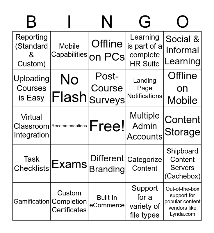 This bingo card has a free space and 24 words: Exams, Custom Completion Certificates, Post-Course Surveys, Gamification, Social & Informal Learning, Reporting (Standard & Custom), Uploading Courses is Easy, Mobile Capabilities, Multiple Admin Accounts, Different Branding, Landing Page Notifications, Virtual Classroom Integration, Categorize Content, Shipboard Content Servers (Cachebox), No Flash, Support for a variety of file types, Content Storage, Offline on PCs, Offline on Mobile, Recommendations, Out-of-the-box support for popular content vendors like Lynda.com, Task Checklists, Learning is part of a complete HR Suite and Built-In eCommerce.