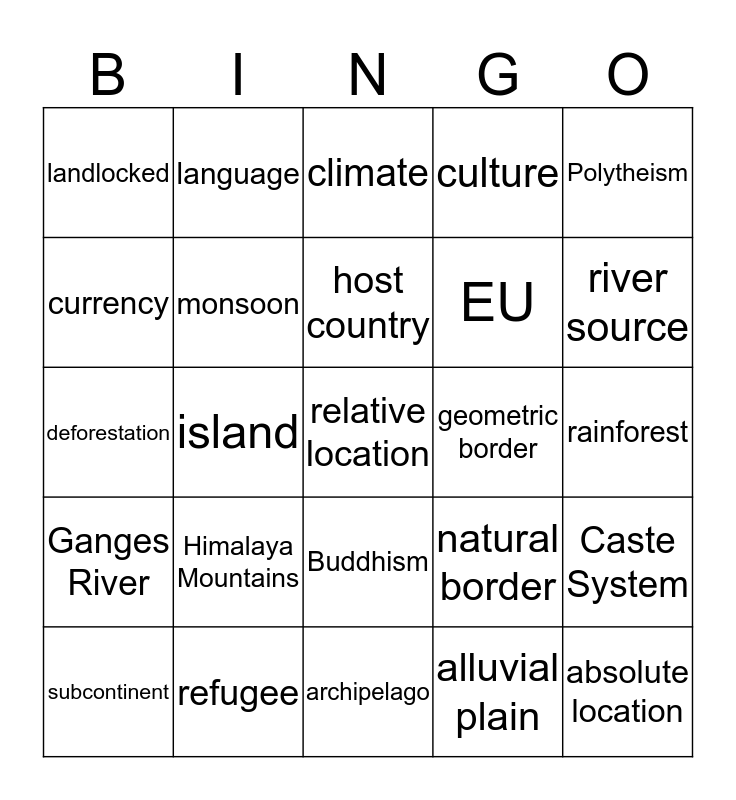 This bingo card has 31 words: archipelago, canal, island, isthmus, landlocked, climate, monsoon, natural border, geometric border, alluvial plain, rainforest, relative location, absolute location, delta, river source, Hinduism, Caste System, Himalaya Mountains, Ganges River, Buddhism, Polytheism, Monotheism, subcontinent, language, EU, currency, culture, deforestation, refugee, host country and political cartoon.