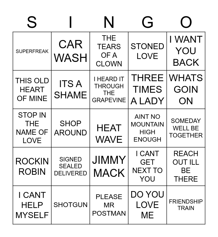 This bingo card has 25 words: SIGNED SEALED DELIVERED, PLEASE MR POSTMAN, I HEARD IT THROUGH THE GRAPEVINE, I CANT HELP MYSELF, I WANT YOU BACK, SUPERFREAK, THIS OLD HEART OF MINE, CAR WASH, AINT NO MOUNTAIN HIGH ENOUGH, JIMMY MACK, THREE TIMES A LADY, STOP IN THE NAME OF LOVE, I CANT GET NEXT TO YOU, REACH OUT ILL BE THERE, ITS A SHAME, FRIENDSHIP TRAIN, SOMEDAY WELL BE TOGETHER, THE TEARS OF A CLOWN, WHATS GOIN ON, SHOP AROUND, HEAT WAVE, SHOTGUN, ROCKIN ROBIN, STONED LOVE and DO YOU LOVE ME.