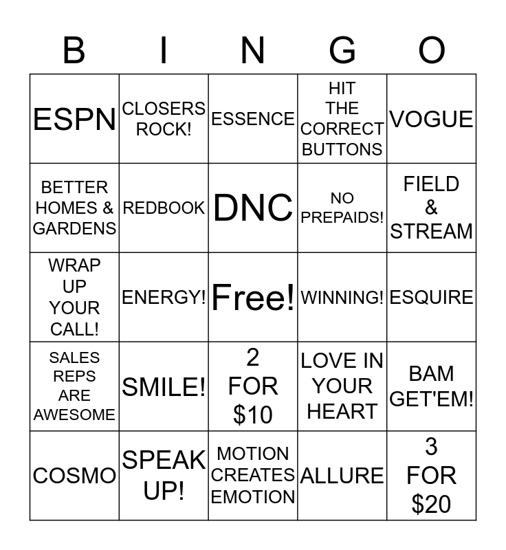 This bingo card has a free space and 24 words: SMILE!, SPEAK UP!, DNC, COSMO, VOGUE, ESPN, BETTER HOMES & GARDENS, CLOSERS ROCK!, WINNING!, 2 FOR $10, NO PREPAIDS!, WRAP UP YOUR CALL!, LOVE IN YOUR HEART, BAM GET'EM!, REDBOOK, ALLURE, ESQUIRE, ESSENCE, FIELD & STREAM, ENERGY!, 3 FOR $20, SALES REPS ARE AWESOME, HIT THE CORRECT BUTTONS and MOTION CREATES EMOTION.