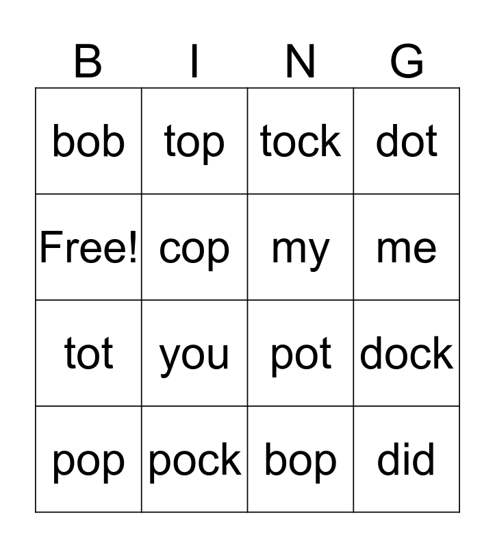 This bingo card has 16 words: pock, dock, tock, bob, tot, top, pot, bop, Free!, cop, pop, dot, you, me, my and did.
