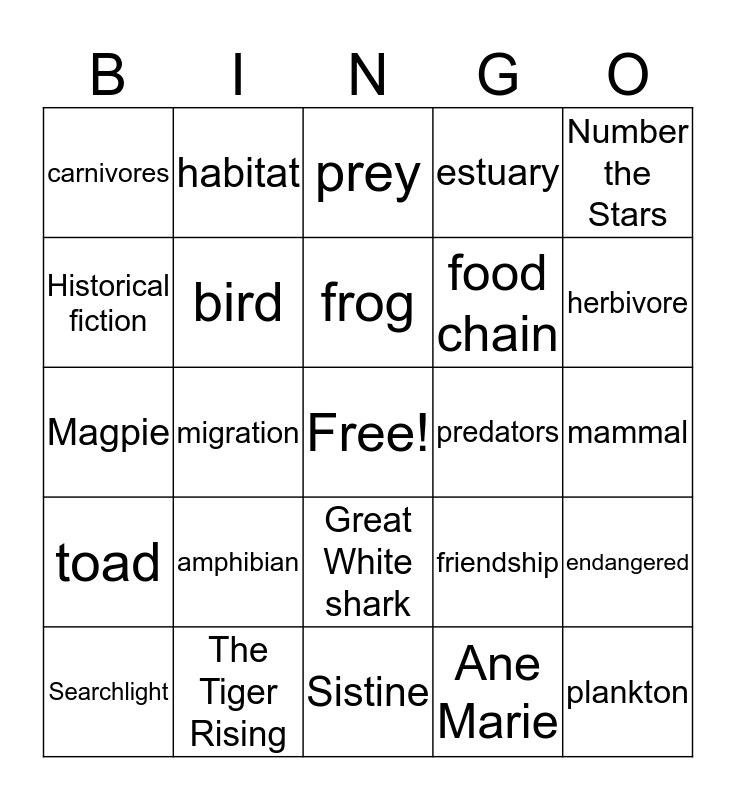 This bingo card has a free space and 24 words: amphibian, The Tiger Rising, frog, Searchlight, Number the Stars, carnivores, Historical fiction, habitat, predators, Great White shark, food chain, Magpie, friendship, endangered, bird, Ane Marie, mammal, prey, herbivore, migration, plankton, toad, estuary and Sistine.