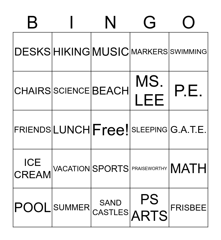 This bingo card has a free space and 24 words: VACATION, SUMMER, BEACH, POOL, SWIMMING, DESKS, CHAIRS, HIKING, SLEEPING, SPORTS, MS. LEE, FRIENDS, PRAISEWORTHY, MATH, SCIENCE, PS ARTS, G.A.T.E., MUSIC, P.E., LUNCH, FRISBEE, ICE CREAM, MARKERS and SAND CASTLES.