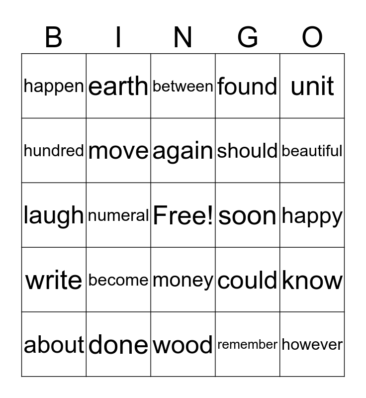 This bingo card has a free space and 27 words: could, would, should, wood, hundred, between, earth, write, soon, know, laugh, found, about, done, beautiful, large, move, again, become, happen, happy, remember, numeral, however, money, unit and notice.