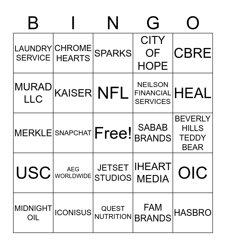 This bingo card has a free space and 24 words: AEG WORLDWIDE, ICONISUS, NFL, MIDNIGHT OIL, CBRE, LAUNDRY SERVICE, MURAD LLC, CHROME HEARTS, SABAB BRANDS, JETSET STUDIOS, NEILSON FINANCIAL SERVICES, MERKLE, IHEART MEDIA, OIC, KAISER, FAM BRANDS, BEVERLY HILLS TEDDY BEAR, SPARKS, HEAL, SNAPCHAT, HASBRO, USC, CITY OF HOPE and QUEST NUTRITION.