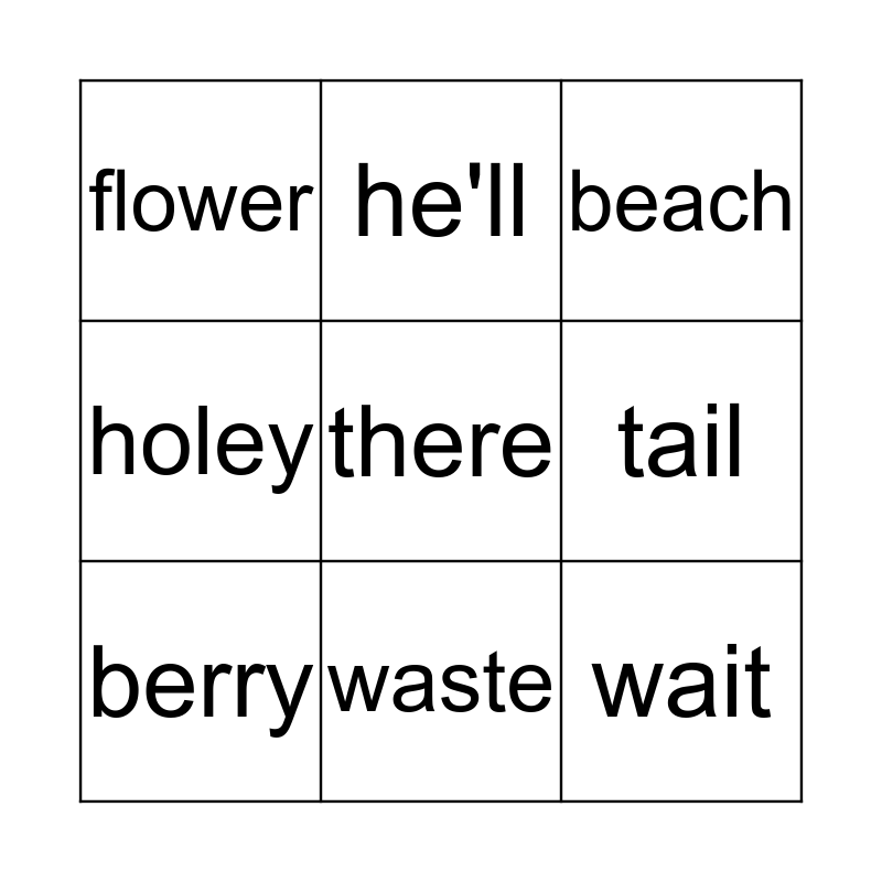 This bingo card has 9 words: berry, beach, he'll, holey, flower, tail, there, wait and waste.