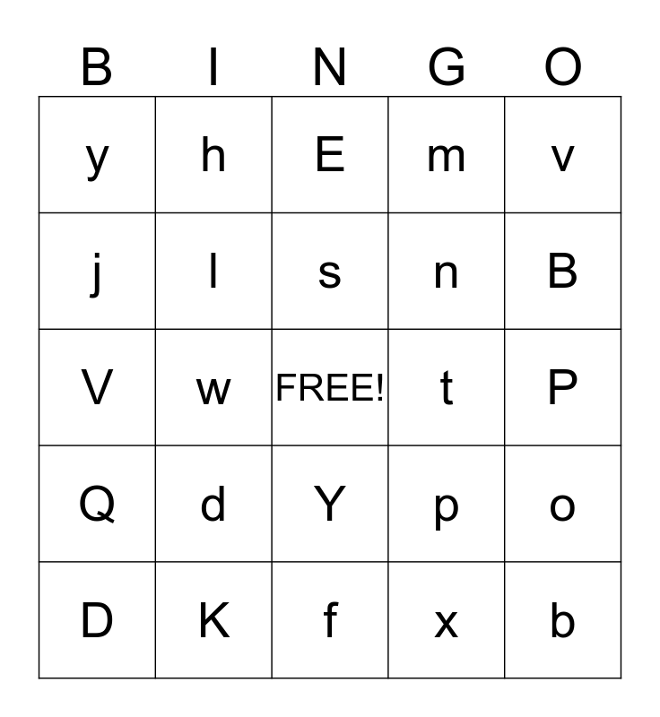This bingo card has a free space and 51 words: a, b, c, f, d, g, h, i, j, k, l, m, o, p, q, r, s, t, u, v, w, x, y, n, z, A, B, C, D, E, F, G, H, I, J, K, L, M, N, O, P, Q, R, S, T, U, V, W, X, Y and Z.
