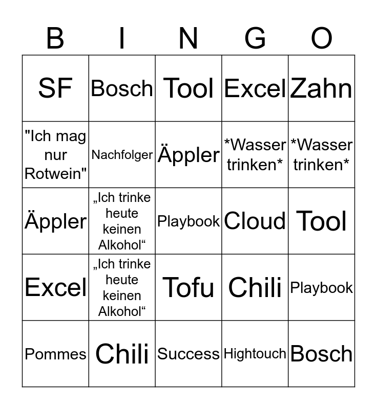 This bingo card has a free space and 43 words: Free!, Bosch, *Gemüse zum Grillen mitbringen*, Pommes, SF, Hightouch, Tool, JIRA, Zahn, Chili, Excel, Cloud, Tofu, „Ich trinke heute keinen Alkohol“, Kaffee, Success, Senior, Äppler, "Ich mag nur Rotwein", *Wasser trinken*, Bosch, *Gemüse zum Grillen mitbringen*, Pommes, SF, Hightouch, Tool, JIRA, Zahn, Chili, Excel, Cloud, Playbook, Tofu, „Ich trinke heute keinen Alkohol“, Kaffee, Success, Senior, Äppler, "Ich mag nur Rotwein", *Wasser trinken*, Franzosen, Nachfolger and T3.