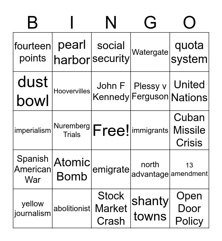 This bingo card has a free space and 24 words: Atomic Bomb, abolitionist, John F Kennedy, yellow journalism, quota system, fourteen points, dust bowl, pearl harbor, immigrants, emigrate, Plessy v Ferguson, imperialism, north advantage, 13 amendment, Hoovervilles, shanty towns, Cuban Missile Crisis, social security, United Nations, Nuremberg Trials, Open Door Policy, Spanish American War, Watergate and Stock Market Crash.