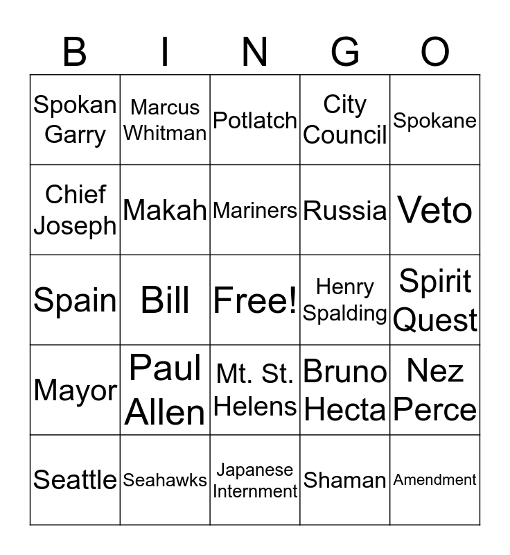 This bingo card has a free space and 24 words: Paul Allen, Seahawks, Mariners, Seattle, Spokane, Spokan Garry, Chief Joseph, Marcus Whitman, Henry Spalding, Mt. St. Helens, Russia, Spain, Bruno Hecta, Nez Perce, Makah, Shaman, Spirit Quest, Potlatch, Veto, Bill, Amendment, Mayor, City Council and Japanese Internment.