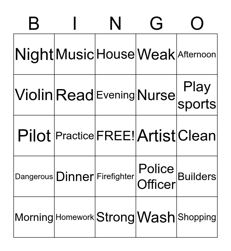 This bingo card has a free space and 24 words: Dinner, Homework, Evening, Morning, Afternoon, Night, Violin, Music, Artist, Firefighter, Nurse, Pilot, Police Officer, Builders, Read, Wash, Clean, House, Play sports, Practice, Shopping, Dangerous, Weak and Strong.