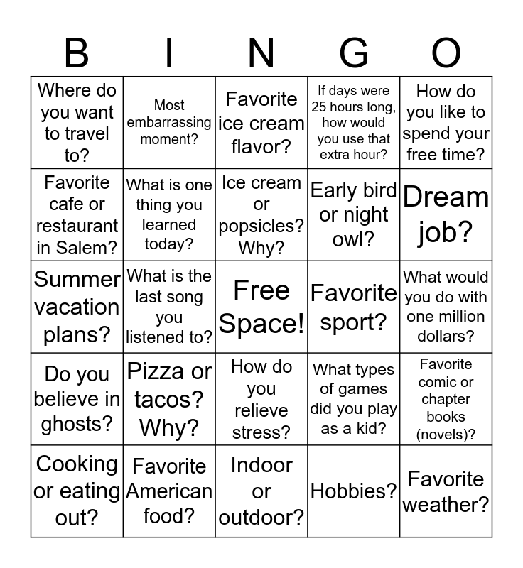 This bingo card has a free space and 24 words: Pizza or tacos? Why?, Favorite American food?, Ice cream or popsicles? Why?, Cooking or eating out?, How do you like to spend your free time?, Where do you want to travel to?, Favorite cafe or restaurant in Salem?, Most embarrassing moment?, Favorite sport?, How do you relieve stress?, Early bird or night owl?, Summer vacation plans?, What types of games did you play as a kid?, Favorite comic or chapter books (novels)?, What is one thing you learned today?, Hobbies?, What would you do with one million dollars?, Favorite ice cream flavor?, Dream job?, What is the last song you listened to?, Favorite weather?, Do you believe in ghosts?, If days were 25 hours long, how would you use that extra hour? and Indoor or outdoor?.