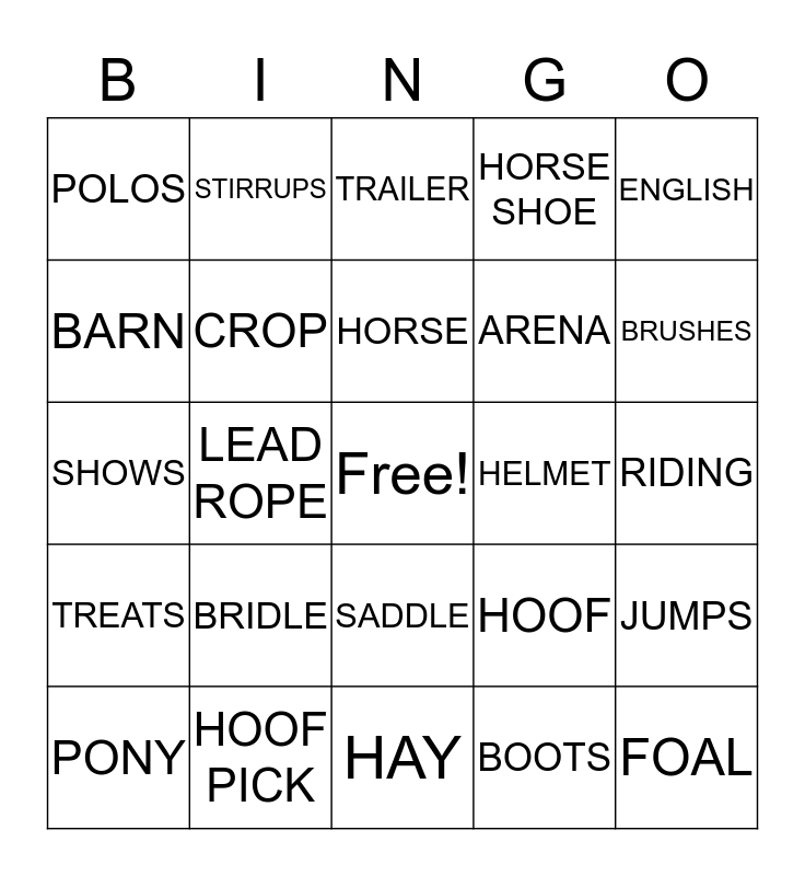 This bingo card has a free space and 24 words: BRIDLE, HOOF PICK, HORSE, PONY, ENGLISH, POLOS, BARN, STIRRUPS, HELMET, SADDLE, ARENA, SHOWS, HOOF, JUMPS, CROP, BOOTS, RIDING, TRAILER, BRUSHES, LEAD ROPE, FOAL, TREATS, HORSE SHOE and HAY.