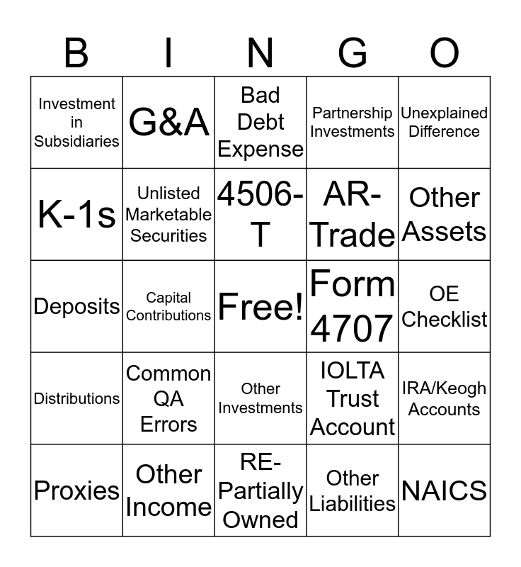 This bingo card has a free space and 24 words: Common QA Errors, Other Income, 4506-T, Proxies, Unexplained Difference, Investment in Subsidiaries, K-1s, G&A, Form 4707, Other Investments, AR-Trade, Deposits, IOLTA Trust Account, IRA/Keogh Accounts, Unlisted Marketable Securities, Other Liabilities, OE Checklist, Bad Debt Expense, Other Assets, Capital Contributions, NAICS, Distributions, Partnership Investments and RE-Partially Owned.