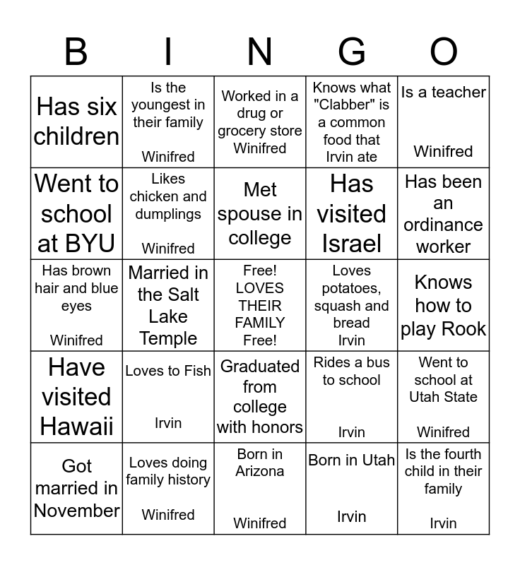 This bingo card has a free space and 24 words: Loves to Fish Irvin, Loves doing family history Winifred, Met spouse in college, Got married in November, Is a teacher Winifred, Has six children, Went to school at BYU, Is the youngest in their family Winifred, Loves potatoes, squash and bread Irvin, Graduated from college with honors, Has visited Israel, Has brown hair and blue eyes Winifred, Rides a bus to school Irvin, Went to school at Utah State Winifred, Likes chicken and dumplings Winifred, Born in Utah Irvin, Knows how to play Rook, Worked in a drug or grocery store Winifred, Has been an ordinance worker, Married in the Salt Lake Temple, Is the fourth child in their family Irvin, Have visited Hawaii, Knows what "Clabber" is a common food that Irvin ate and Born in Arizona Winifred.